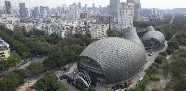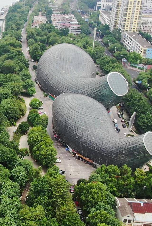 设计团队又引用了郭沫若的诗句“驾驭鱼龙飞九有,神州到处是歌台”,把大剧院想象成两条跃出水面的鱼。两座主体建筑都用弧形曲面构成,一大一小,像两条鱼在江边追逐,这种造型在全球范围内也少见。