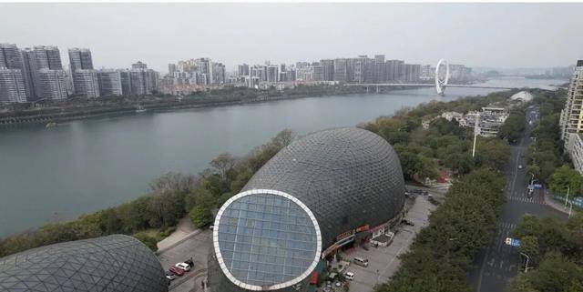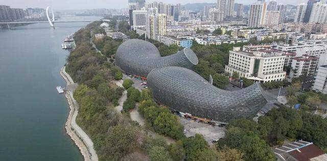 无人机从高空拍下的画面里,这两座建筑看起来像是趴在地上的蜗牛,也有人开玩笑说像是不小心丢在江边的“夜壶”。其实,这是当地一个叫“双鱼汇”的文化项目,据称总投资超过3亿元,是柳州市重点打造的十大文化工程之一。