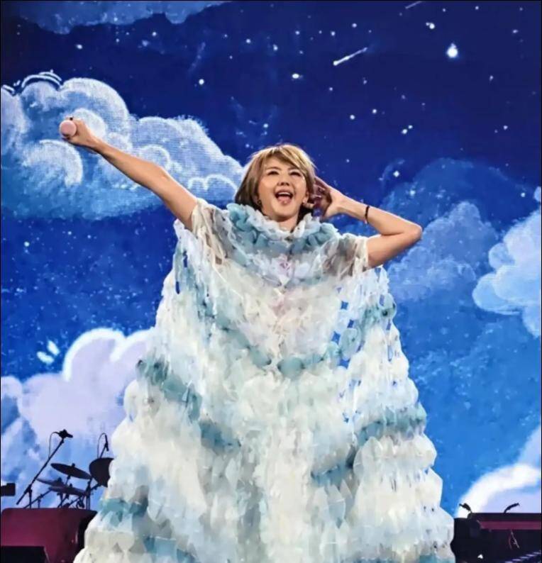 蓝白纱裙造型则用力过猛,本想营造梦幻感,却因蓬松过度、材质廉价,远看像几百个一次性口罩缝在一起,臃肿怪异。网友调侃,裙子空间大到能藏下孙燕姿的两个孩子,完全违背纱裙的轻盈柔美,与她的清新气质格格不入。